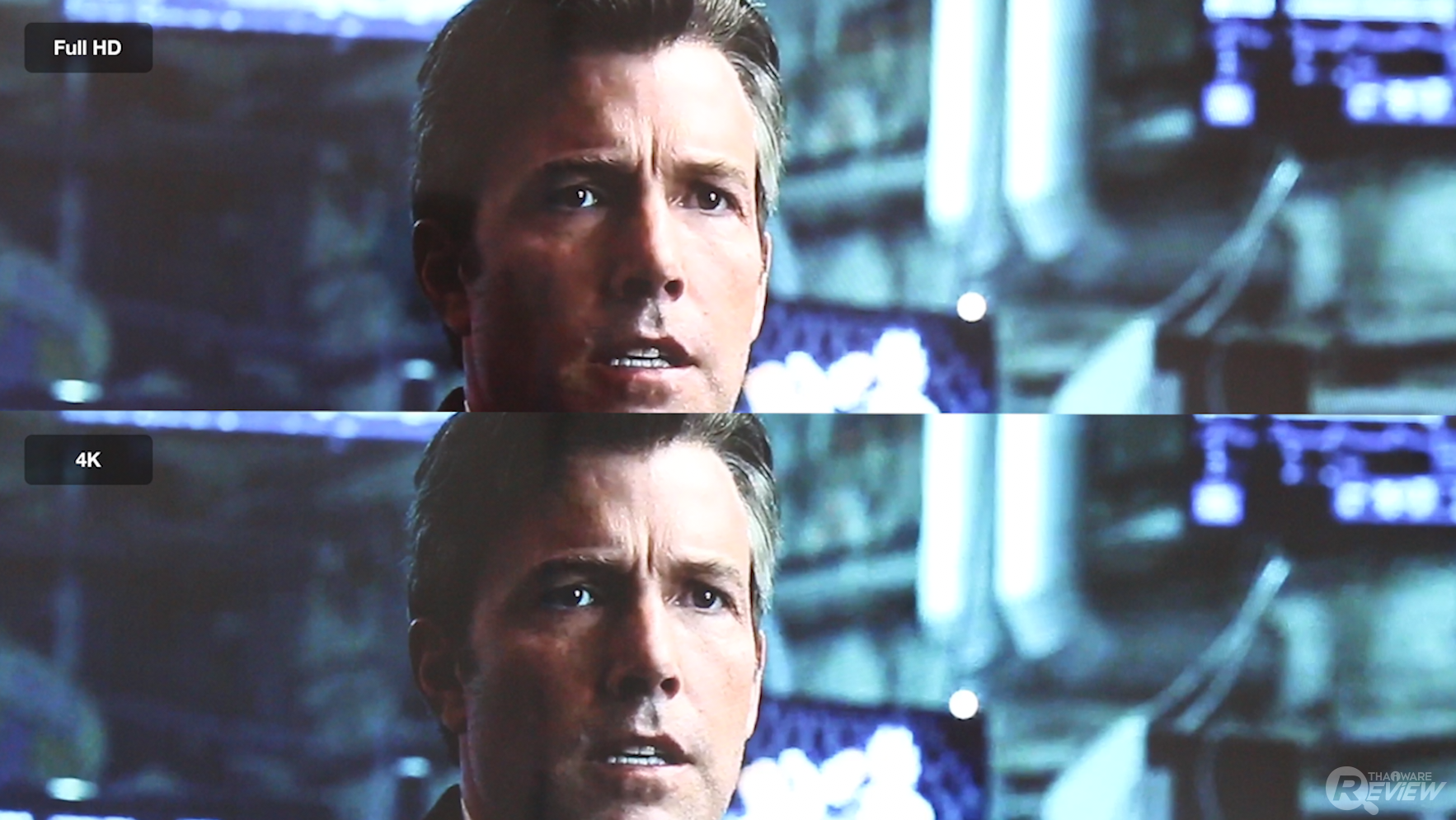ส่วนทางด้านฟรีทีวีดิจิตอล ก็จะคล้ายๆ กับการเปิดไฟล์ Full HD คือเพิ่มความคมชัดทั้งขอบภาพและสีสัน ให้ดูมีความละเอียดมากพอที่จะแสดงผลบนจอ 4K ได้ แต่กับบางรายการ เช่นหนังเก่าๆ ที่มีความละเอียดน้อย ก็ดันความคมชัดขึ้นมาไม่ไหวเหมือนกัน