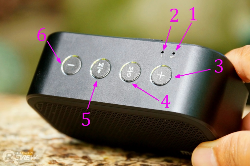 ด้านหลังลำโพงมีช่องเสียบสาย USB เพื่อชาร์จแบตฯ ลำโพง (1) และมีช่องเสียบการ์ด microSD (2) เพื่อการเปิดเล่นเพลงโดยอัตโนมัติ รองรับการเล่นไฟล์เพลงจากการ์ด microSD ได้ทั้งแบบที่บีบอัด และไม่บีบอัดคุณภาพเสียงได้หลายฟอร์แมต อาทิ APE, MP3, WMA, WAV และ FLAC เราลองโหลดไฟล์ MP3 ลงในการ์ด แล้วเสียบเข้ากับลำโพง มันก็เริ่มเล่นเพลงโดยอัตโนมัติ ใช้งานง่ายมากๆ และรองรับการเล่นไฟล์เพลงที่มีชื่อภาษาไทยด้วยครับ