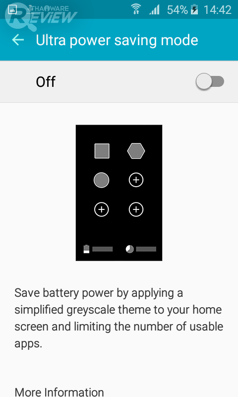 มีโหมดประหยัดพลังงานสูงสุด (Ultra power saving mode) ใส่มาให้ด้วย นอกเหนือจากโหมด (Power saving mode) ประหยัดพลังงานธรรมดา โดยจะเปลี่ยนการแสดงผลเป็นขาวดำ และใช้งานแอปฯ ได้เฉพาะที่เราตั้งไว้ และการเชื่อมต่ออินเทอร์เน็ตจะถูกตัดเมื่อเราปิดหน้าจออัตโนมัติ