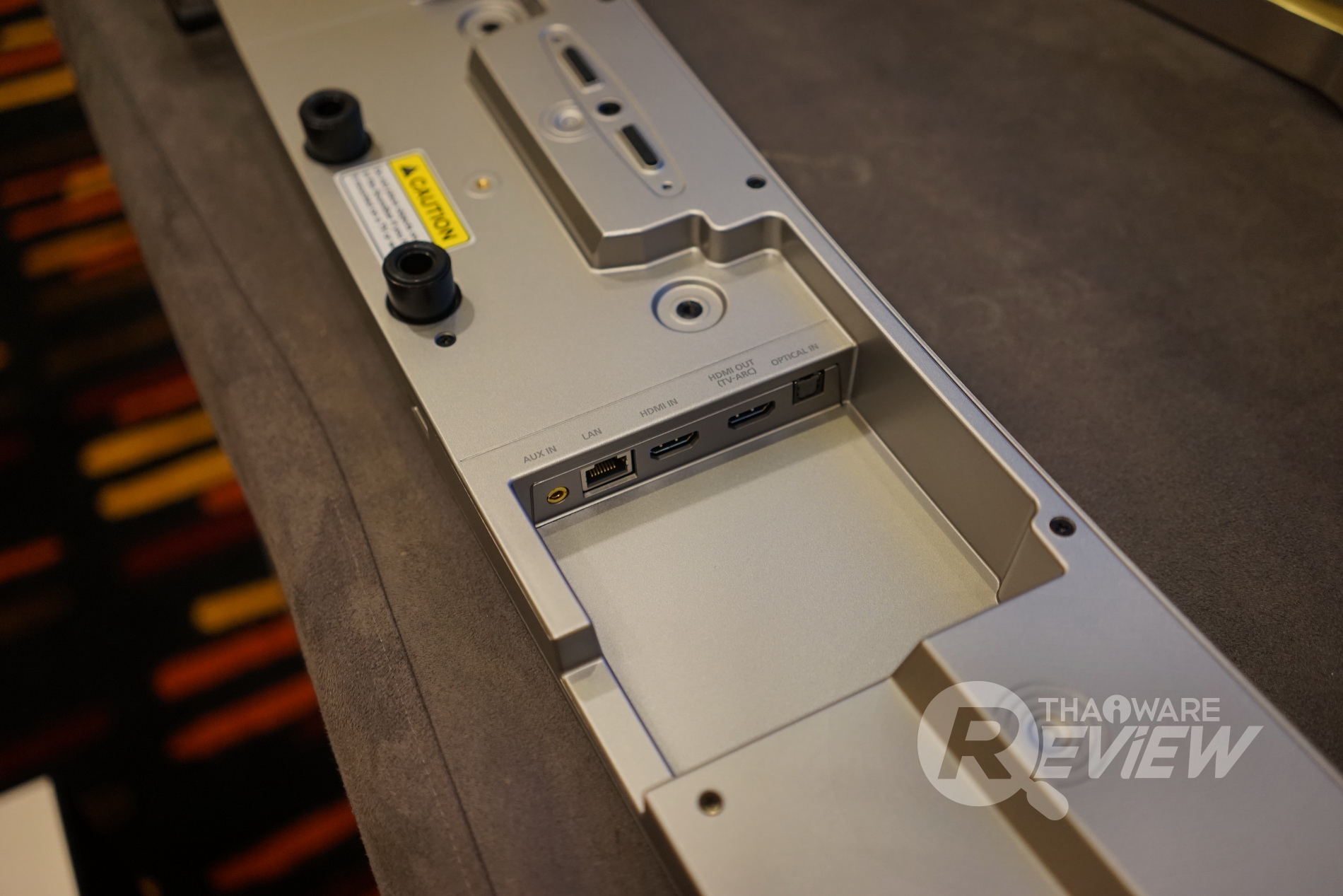พอร์ตการเชื่อมต่อต่างๆ จะอยู่ทางด้านใต้ตัวซาวด์บาร์ มีช่องสำหรับโยงสายออกมาด้วยหลังได้ โดยพอร์ตต่างๆ ประกอบไปด้วย Aux In, LAN, HDMI In, HDMI Out และ Optical In