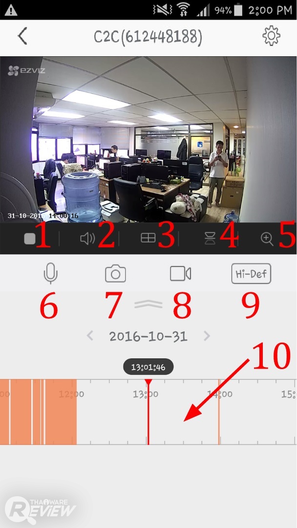 เมื่อเปิดแอป ezviz เข้ามาจะเป็นตามภาพทางด้านซ้าย ที่แสดงภาพพรีวิวของกล้องทุกตัวที่เชื่อมต่ออยู่กับสมาร์ทโฟน จะดูภาพแบบ Real time จากกล้องตัวไหนก็แตะเข้าไปเลยครับ ก็จะมายังหน้าจอในภาพขวา ที่แสดงวิดีโอจากกล้องแบบ Real time นอกจะมีภาพแล้วยังมีเสียงสดๆ มาให้ฟังพร้อมกันด้วย (ใครจะนินทาเจ้านายอย่าพูดเสียงดังนะครับ ถ้าเจ้านายเปิดกล้องดูอยู่ก็เป็นเรื่องแน่นอน 555) ซึ่งการดูภาพสดผ่าน Wi-Fi ให้สัญญาณภาพที่สมูทดีมากๆ เลยครับ และสามารถเปิดดูได้ต่อเนื่องแบบยาวๆ ไม่มีการตัดสัญญาณ แต่สำหรับการเปิดดูนอกสถานที่ผ่านสัญญาณอินเทอร์เน็ตมือถือ ความลื่นไหลจะไม่เท่าเปิดดูผ่าน Wi-Fi และเปิดดูได้เพียงช่วงสั้นๆ สัญญาณก็จะตัดไปครับ