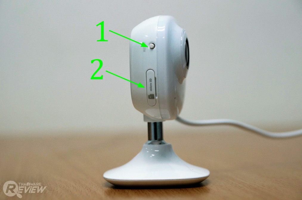 ด้านข้างซ้ายของตัวกล้องมี ปุ่ม Reset (หมายเลข 1) กดค้าง 3 วินาทีเพื่อให้กล้องกลับไปเป็นค่าเริ่มต้น สำหรับกรณีที่เราต้องการย้ายกล้องวงจรปิดไปเชื่อมต่อผ่าน Wi-Fi ตัวอื่น โดยการ Reset นี้จะไม่ได้ลบคลิปวิดีโอที่เก็บอยู่ในการ์ด microSD ครับ ส่วนหมายเลข 2 เป็นช่องเสียบการ์ด microSD
