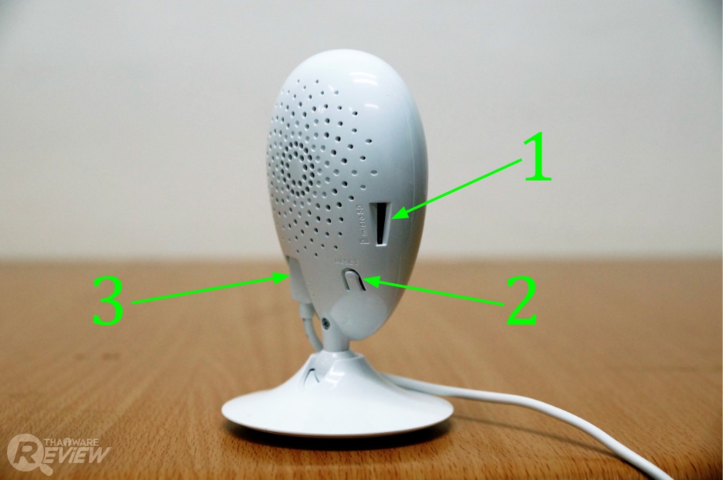 ด้านหลังของตัวกล้องมี ช่องเสียบการ์ด microSD (หมายเลข 1) และปุ่ม Reset (หมายเลข 2) กดค้าง 3 วินาทีเพื่อให้กล้องกลับไปเป็นค่าเริ่มต้น สำหรับกรณีที่เราต้องการย้ายกล้องวงจรปิดไปเชื่อมต่อผ่าน Wi-Fi ตัวอื่น โดยการ Reset นี้จะไม่ได้ลบคลิปวิดีโอที่เก็บอยู่ในการ์ด microSD ครับ และหมายเลข 3 คือ ช่องพอร์ตเสียบสาย USB สำหรับเสียบเชื่อมต่อกับอะแดปเตอร์
