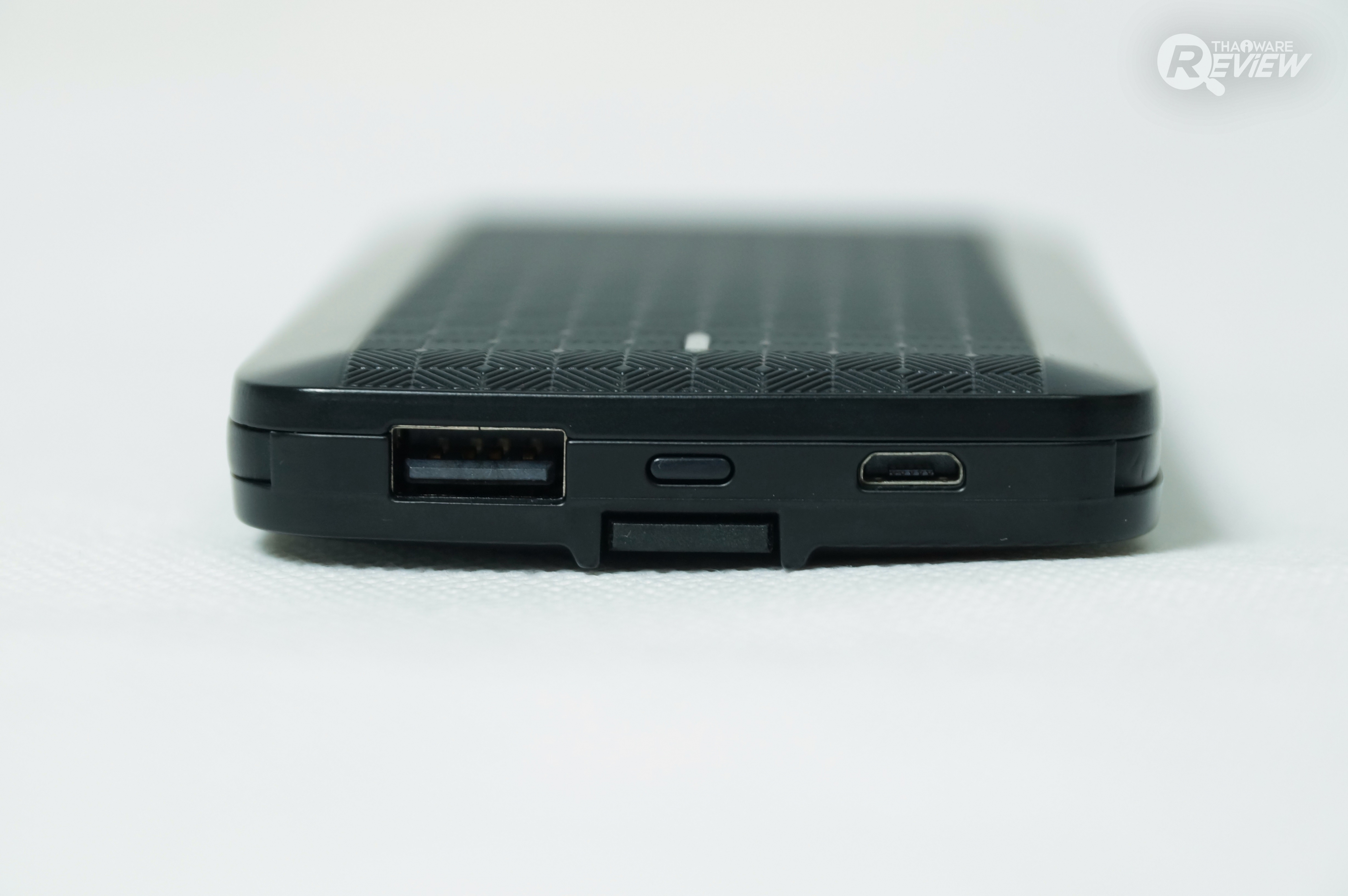 ด้านซ้าย (ฝั่งด้านที่เป็นไฟ LED) จะเป็นช่องพอร์ต USB 1 ช่อง (USB output port 0.5-2.4A MAX) สำหรับต่ออุปกรณ์เพิ่ม และ ช่อง Micro USB 1 ช่อง (Micro USB input port) สำหรับชาร์จแบตฯ พาวเวอร์แบงค์ ตรงกลางเป็นปุ่มพาวเวอร์สำหรับเปิด เพื่อทำการชาร์จหรือเช็คสถานะแบตเตอรี่ที่เหลือ