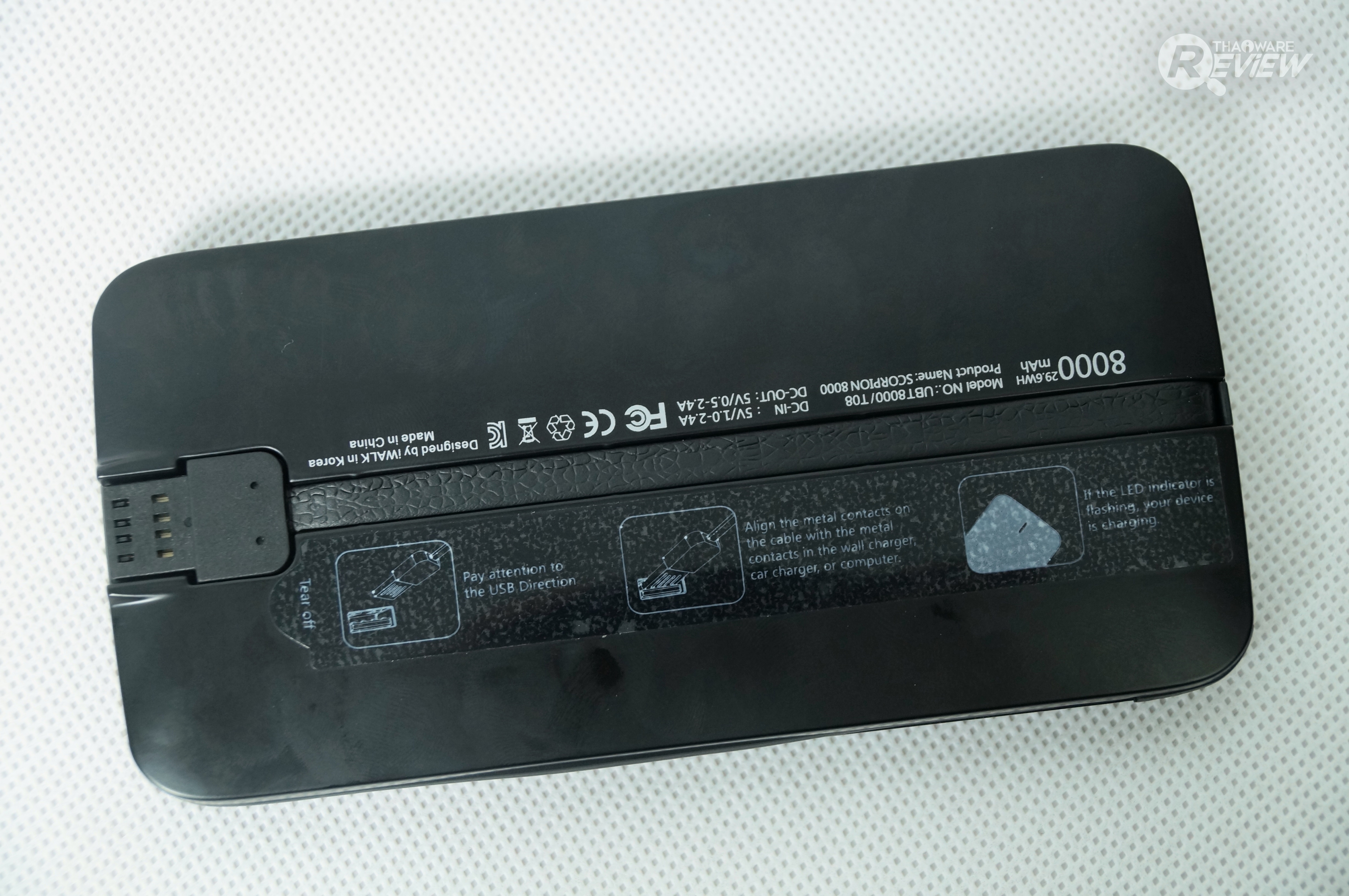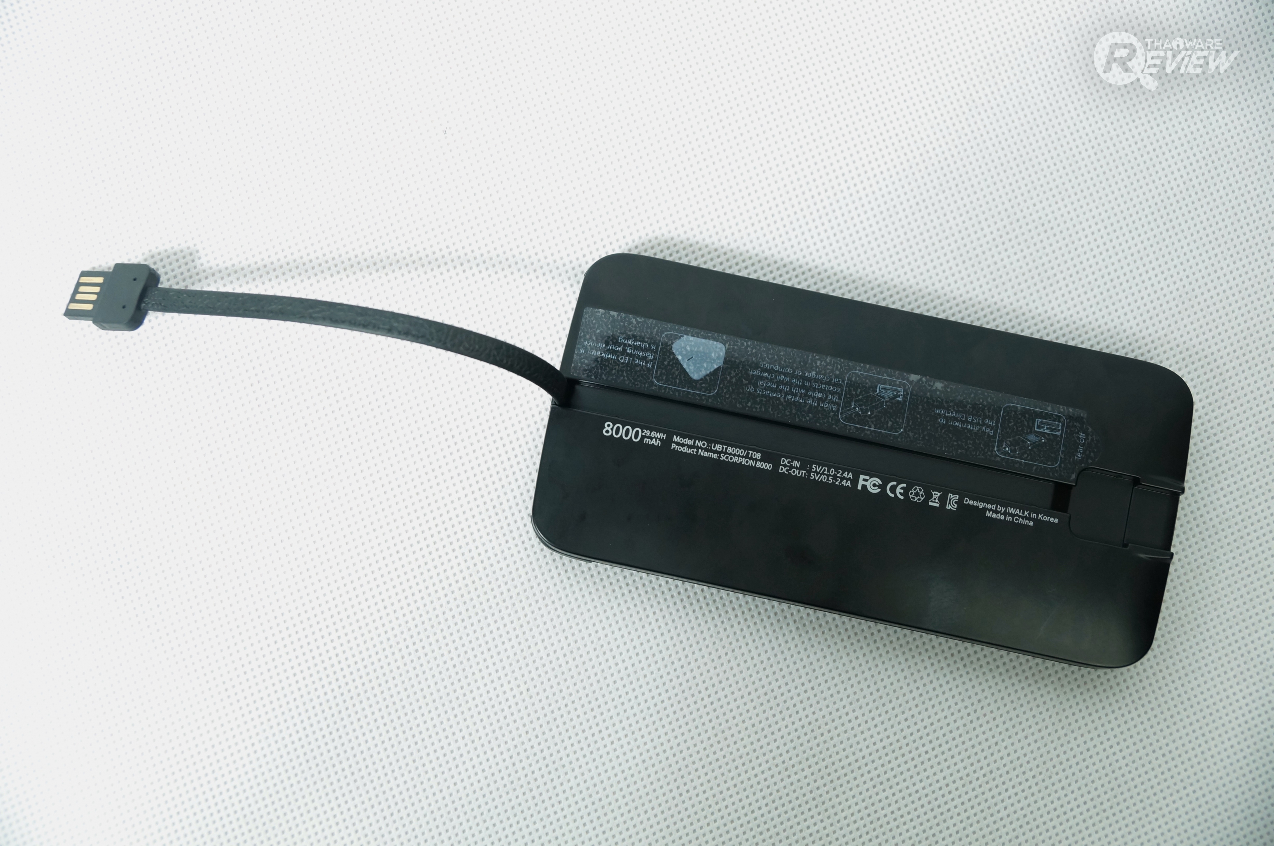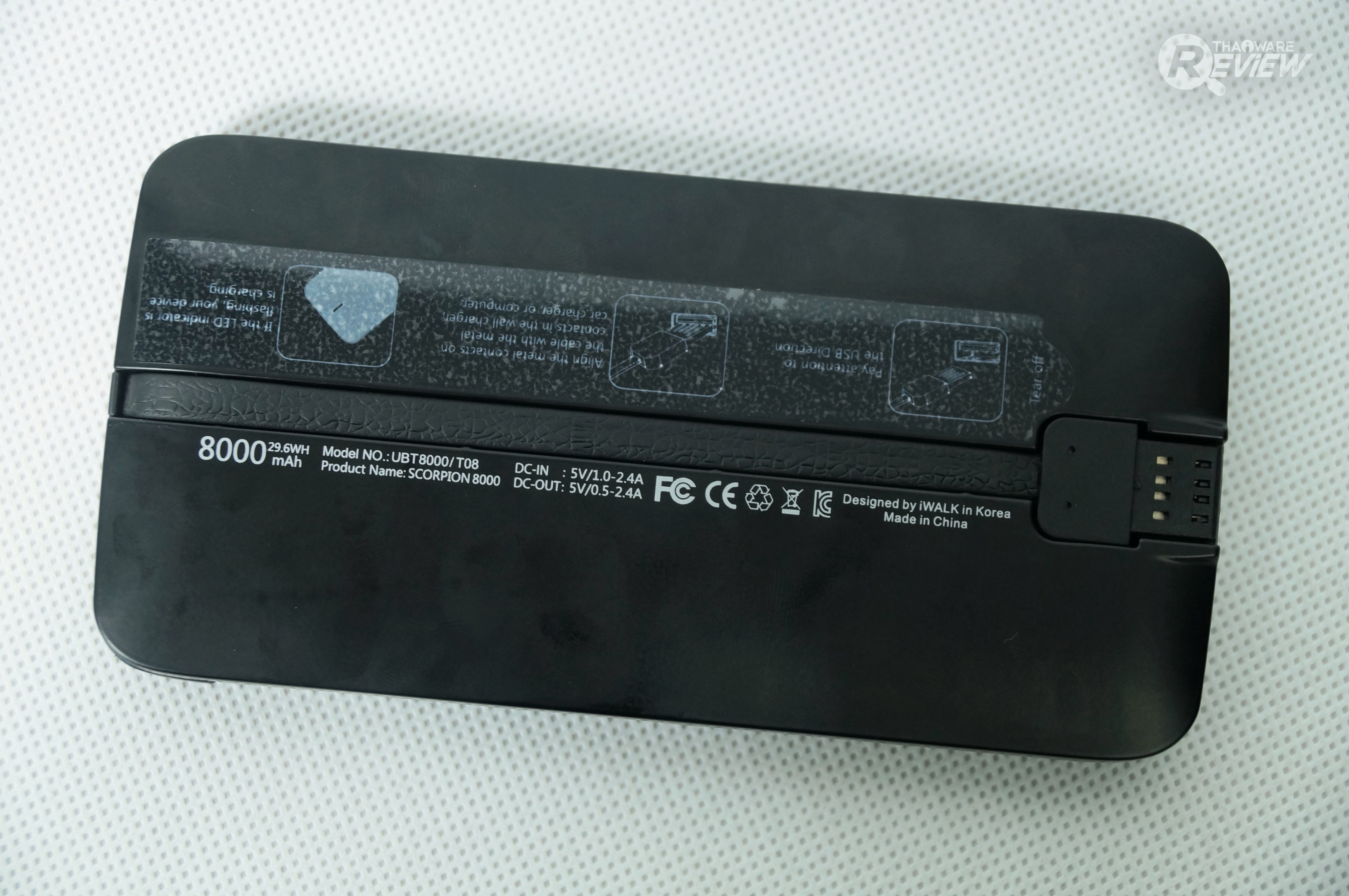 ในส่วนของด้านหลัง จะมีสาย USB สำหรับชาร์จพลังงานให้ตัว iWalk 8000 และมีสติ๊กเกอร์คำแนะนำการใช้งานเบื้องต้น