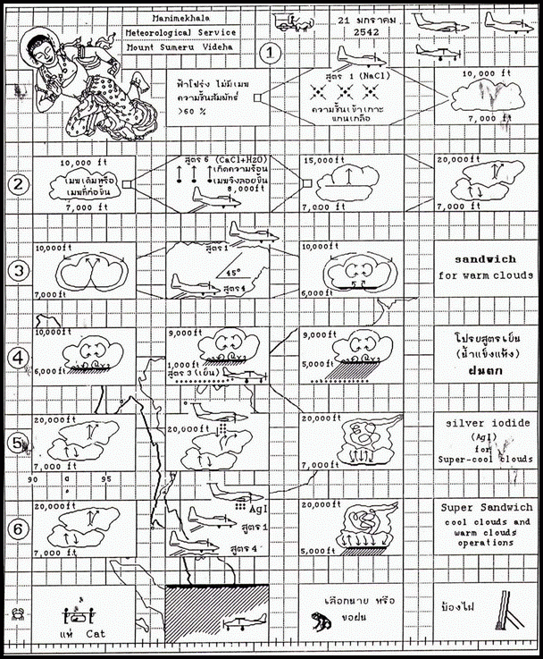 “หลักการแรก คือ ให้โปรยสารดูดซับความชื้น (เกลือทะเล) จากเครื่องบิน เพื่อดูดซับความชื้นในอากาศ แล้วใช้สารเย็นจัด (น้ำแข็งแห้ง) เพื่อให้ความชื้นกลั่นตัวรวมกันเป็นเมฆ”