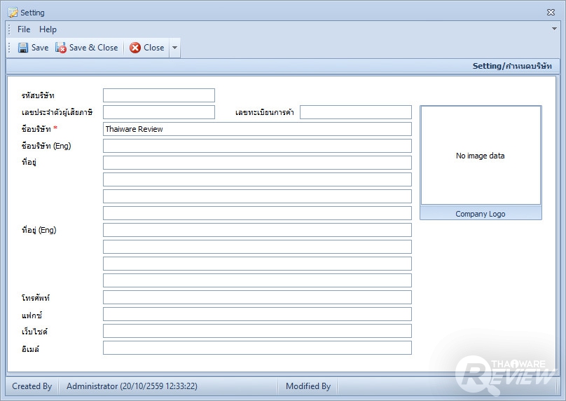 ส่วนแรกเป็นการกำหนดรายละเอียดต่างๆ ของบริษัท ตั้งแต่ชื่อบริษัท ที่อยู่ รหัสบริษัท โลโก้บริษัท เลขทะเบียนการค้า เลขประจำตัวผู้เสียภาษี และช่องทางการติดต่อต่างๆ