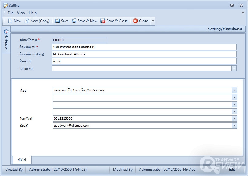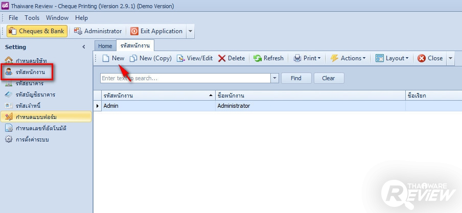 สำหรับการเพิ่มรายละเอียดพนักงานในฐานข้อมูล สามารถทำได้ในส่วนของเมนู รหัสพนักงาน โดยในหน้าต่างนี้ เราสามารถที่จะ เพิ่มข้อมูลใหม่ (New), คัดลอกข้อมูล (New(Copy)), ชมหรือแก้ไขข้อมูล (View/Edit), ลบข้อมูล (Delete) รวมถึงการนำเข้า/ส่งออกข้อมูลได้ ซึ่งในเมนูต่อๆ ไปหลังจากนี้ ก็จะมีหน้าตา UI และคำสั่งต่างๆ เช่นเดียวกัน