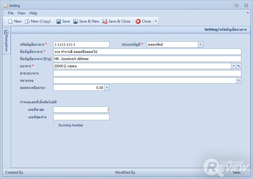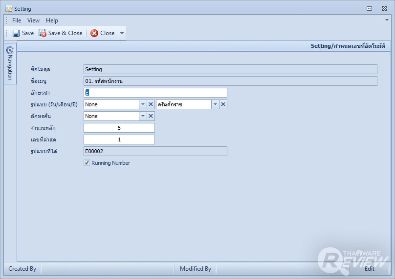 ยกตัวอย่างเช่น การกำหนดเลขที่อัตโนมัติ สำหรับ รหัสพนักงาน จะให้เราเลือกอักษรเริ่มต้นสำหรับรหัส พร้อมกำหนดจำนวนหลักเลขได้ ส่วนรูปแบบของวันที่ หรือ อักษรคั่น จะใส่หรือไม่ใส่ก็ได้ และท้ายสุดจะมีตัวอย่างของ รูปแบบที่ตั้งค่า ให้ชมด้วย
