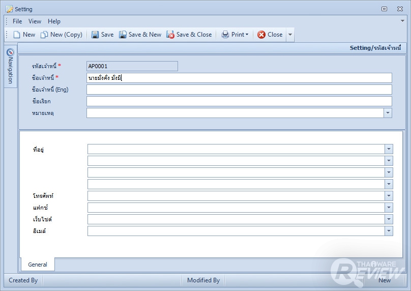 ต่อมาในส่วนของ 'รหัสเจ้าหนี้' หรือก็คือ ผู้รับเช็คหรือผู้รับเงินนั่นเอง โดยสามารถกรอกข้อมูลได้เหมือนกับ 'รหัสพนักงาน' ได้แก่ ชื่อเจ้าหนี้ ที่อยู่ เบอร์โทร เว็บไซต์หรืออีเมล