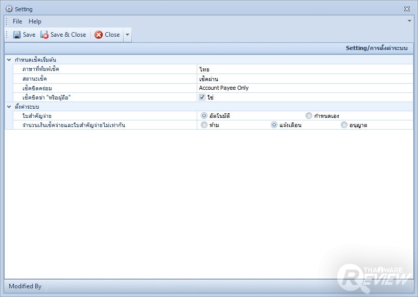 ส่วนสุดท้ายของเมนูตั้งค่า ก็คือการตั้งค่าระบบ ซึ่งส่วนใหญ่จะเป็นระบบของการออกเช็ค ไม่ว่าจะเป็น ภาษาที่ใช้ในการพิมพ์เช็ค สถานะเมื่อออกเช็ค คำขีดคร่อมเช็ค หรือการขีดฆ่าเช็ค