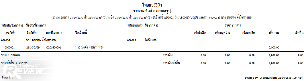 ในส่วนของ 'รายงานเช็คจ่าย' เราสามารถเรียกดูความเคลื่อนไหวของการจ่ายเช็คสำหรับพนักงานแต่ละคนได้ โดยผู้ใช้งาน สามารถกำหนดช่วงเวลา วันที่ และช่วงรหัสของเจ้าหนี้ได้ โดยรายงานจะออกมาในลักษณะนี้