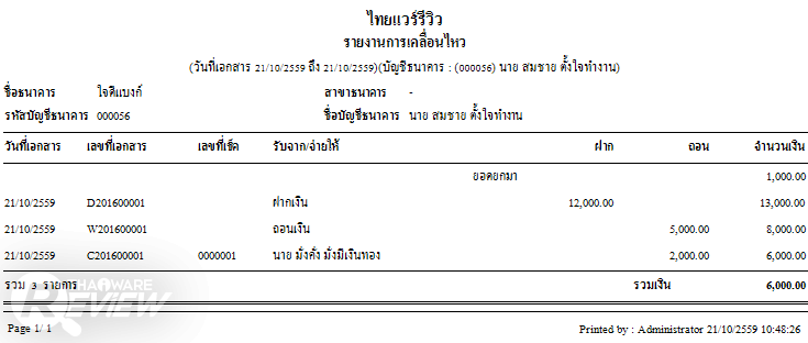 ในส่วนของการ 'ฝากเงิน' เราจะต้องเลือกบัญชีธนาคารของพนักงานคนนั้นๆ ที่ได้เพิ่มเข้าไปในส่วนของฐานข้อมูล เพื่ออัปเดตยอดการฝากเงิน เลือกวันที่สำหรับการออกเอกสารและจำนวนเงิน สามารถใส่หมายเหตุเพิ่มเติมได้ ส่วนเลขที่เอกสารจะรันตามรูปแบบที่เราตั้งเอาไว้