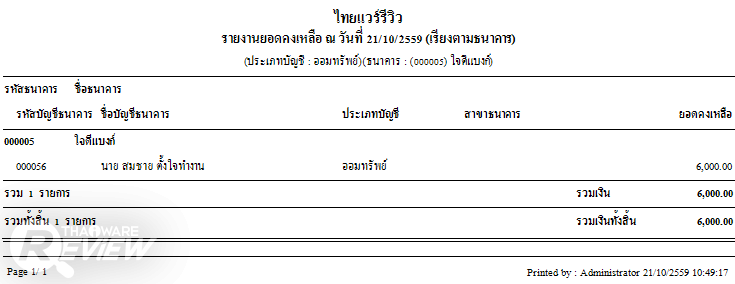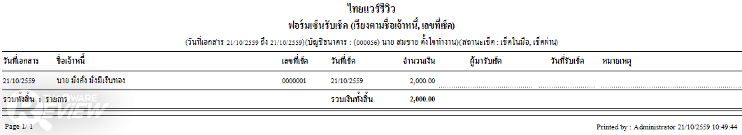 สุดท้ายเป็นการตรวจสอบ 'ฟอร์มเช็นรับเช็ค' แยกออกมาเป็นพนักงานแต่ละคน ซึ่งผู้ใช้ก็สามารถกำหนดช่วงวันที่ต้องการผลการรายงานได้เช่นกัน รวมทั้งสามารถเลือก สถานะเช็คและการเรียงข้อมูลในรูปแบบต่างๆ ได้ ซึ่งผลของการรายงาน จะออกมาหน้าตาแบบนี้