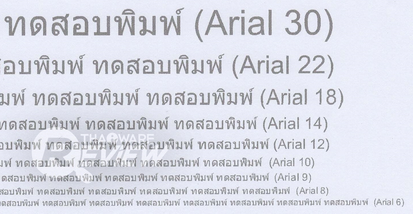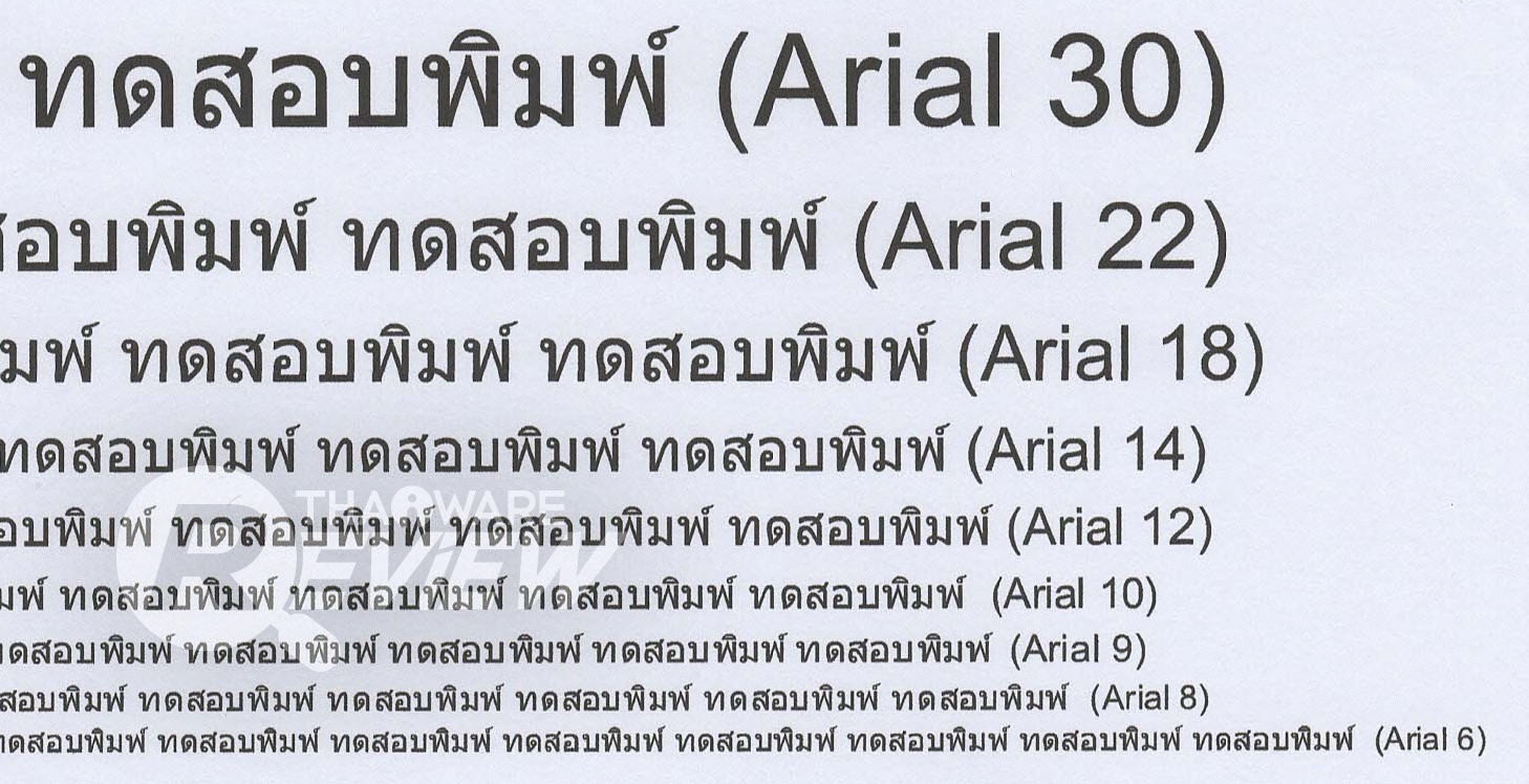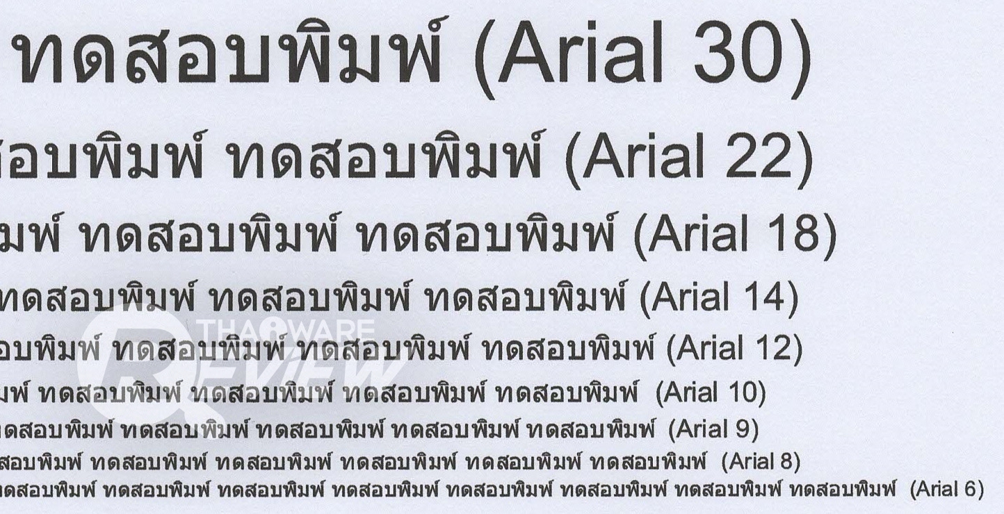 ที่ระดับ คุณภาพสูง ตัวอักษรสีดำเข้ม และมีความคมชัดดีมากๆ ตัวอักษรฟอนต์เล็ก 6 Point ก็ยังอ่านได้รู้เรื่อง ข้อสังเกตคือ ลายเส้นของตัวอักษรจะมีความหนากว่าการพิมพ์ที่ระดับ คุณภาพมาตรฐาน อยู่พอควรครับ