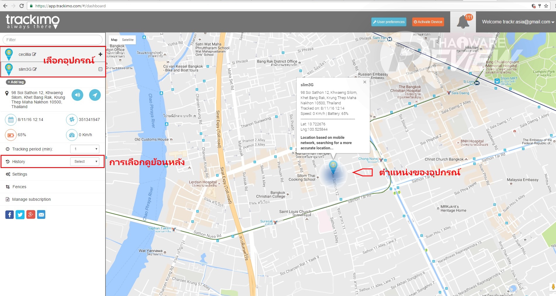 หน้าการใช้งาน Trackimo สามารถเลือกอุปกรณ์ที่ต้องการทราบตำแหน่ง หรือทำการดูตำแหน่งการเดินทางย้อนหลังก็ได้เช่นกัน โดยอุปกรณ์ที่เราต้องการติดตามจะขึ้นแสดงรายชื่ออยู่ทางด้านซ้ายมือทั้งหมด