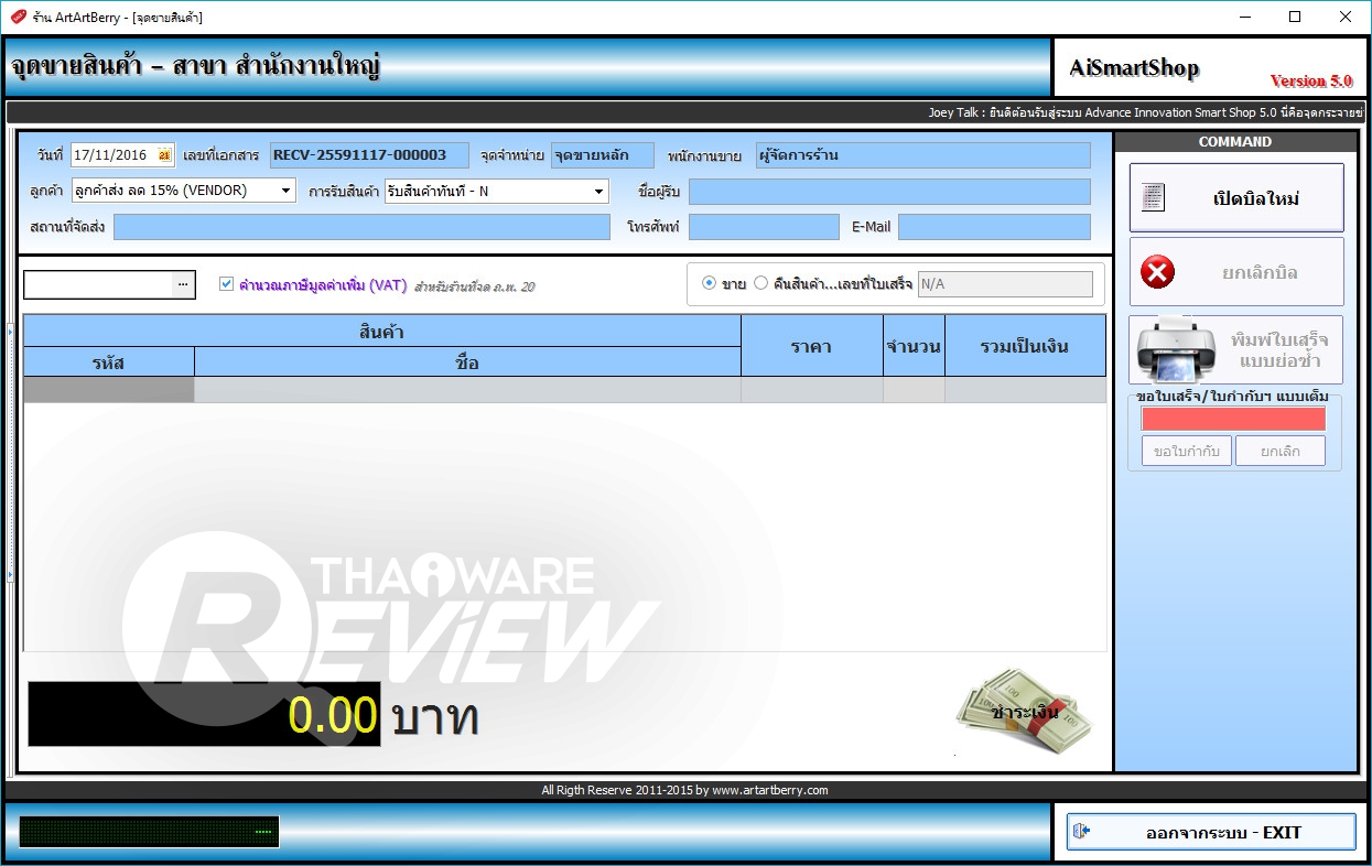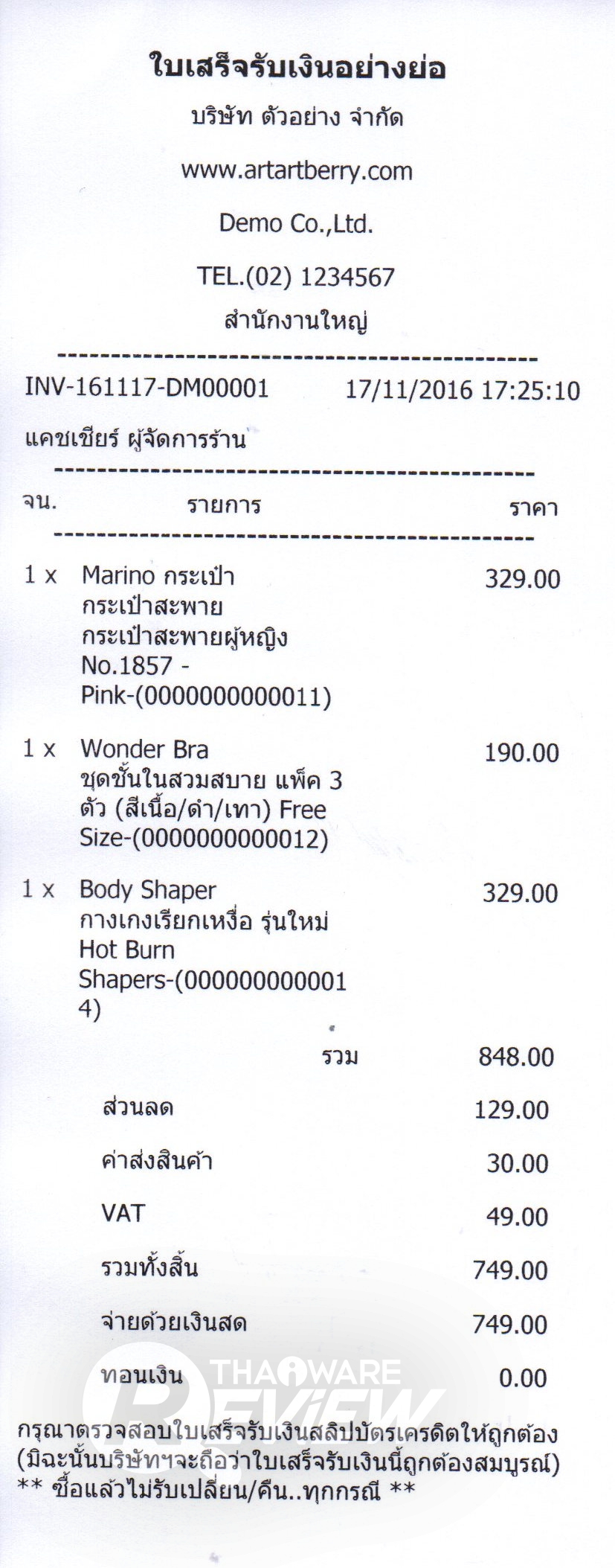 ระบบจะมีวิธีการชำระเงินต่างๆ ทั้งเงินสด, บัตรเครดิต, การโอนเงินผ่านธนาคาร และเครดิตลูกค้า ซึ่งเมื่อใส่จำนวนเงินเรียบร้อย ก็สามารถกดพิมพ์ใบเสร็จได้เลย เป็นอันเสร็จสิ้นขั้นตอนการขายสินค้า และหน้าตาของใบเสร็จจะออกมามีลักษณะนี้