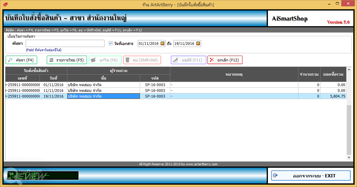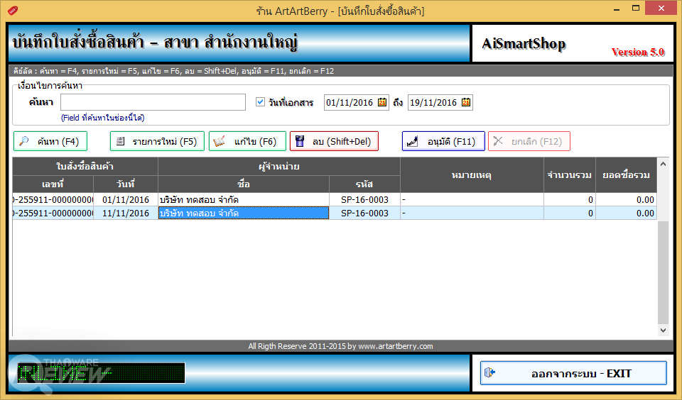 เมื่อเพิ่มรายการสั่งซื้อในหน้าหลักเรียบร้อยแล้ว ก็สามารถคลิกที่รายการ กด อนุมัติ (F11) ได้เลย รายการที่ทำการอนุมัติแล้ว ก็จะเปลี่ยนเป็น สีฟ้า