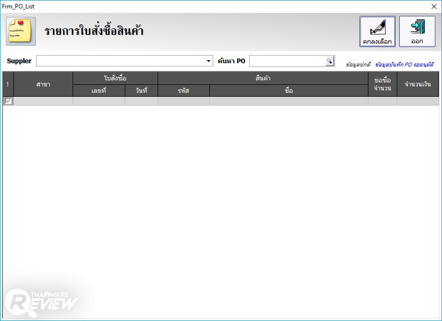เมื่อเปิดรายการใหม่ขึ้นมา ระบบจะให้ทำการเลือกสินค้าที่ต้องการสั่งซื้อ จากผู้จำหน่ายในรายการที่บันทึกเอาไว้ในระบบ โดยเราสามารถดึงรายการสินค้าได้จากเมนู สินค้า (สามารถเลือกที่ไอคอน ... ได้เลย) เมื่อเลือกสินค้าและจำนวนเสร็จเรียบร้อย ให้กดปุม บันทึก/ออก