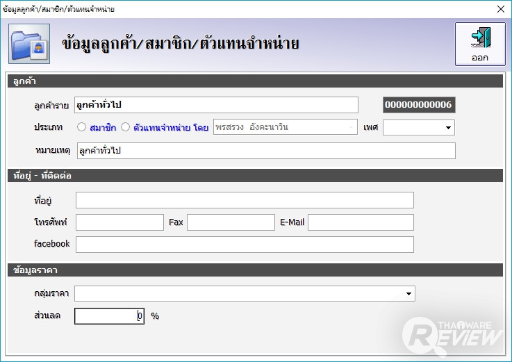 สำหรับรายละเอียดต่างๆ นั้น เราสามารถกำหนดได้ตั้งแต่ ประเภท/หมวดหมู่ของลูกค้า, เพศ, ที่อยู่และข้อมูลสำหรับติดต่อ รวมทั้งกำหนดกลุ่มราคา/ส่วนลดได้