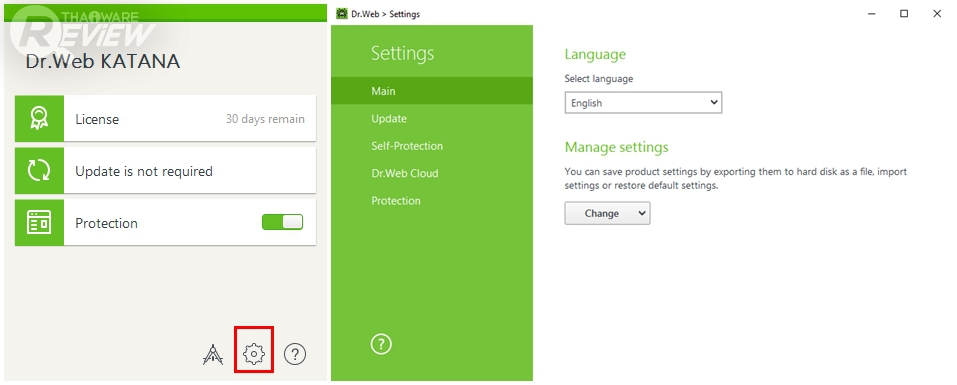 5. Settings - เป็นเมนูที่มีการใช้งานเยอะที่สุด เนื่องจาก หากต้องการตั้งค่าการใช้งาน หรือการป้องกันของโปรแกรม Dr.Web KATANA ก็สามารถเข้ามาตั้งค่าตามหัวข้อได้ทันที โดยมันจะถูกออกเป็น 5 ส่วน คือ