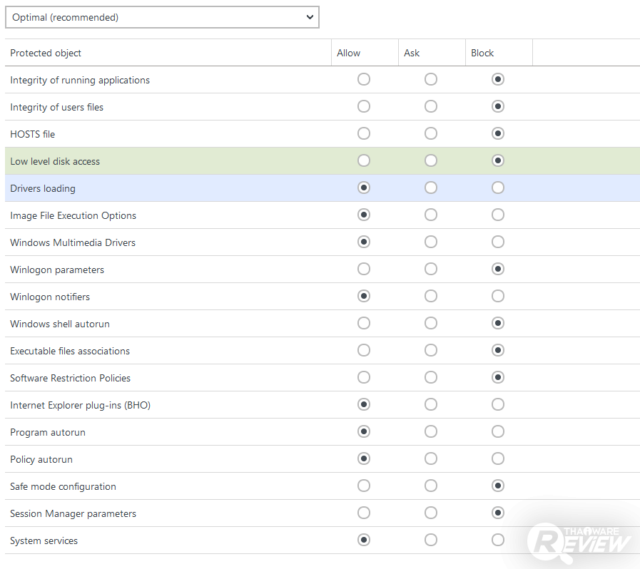Optimal (Recommended) - ปิดกั้นการใช้งานที่จะเข้ามาเปลี่ยนแปลงระบบภายในเครื่องคอมพิวเตอร์ ที่อาจจะทำให้เกิดอันตรายต่อตัวผู้ใช้โดยอัตโนมัติ ทั้งยังสามารถบล็อกการเข้าถึงดิสก์ในระดับต่ำ (Low-level disk) และป้องกันการเปลี่ยนแปลงไฟล์ Hosts