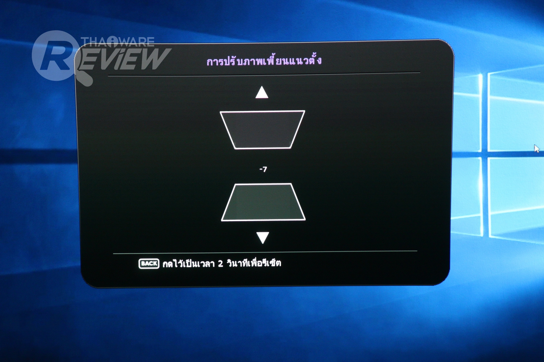 ในการใช้งาน หลังจากเปิดโปรเจคเตอร์แล้ว หากเราตั้งตัวเครื่องต่ำกว่าจอรับภาพ ภาพก็จะมีความเบี้ยวเกิดขึ้น เราก็เข้ามาแก้ไขได้ใน Keystone (การปรับภาพเพี้ยน) ครับ