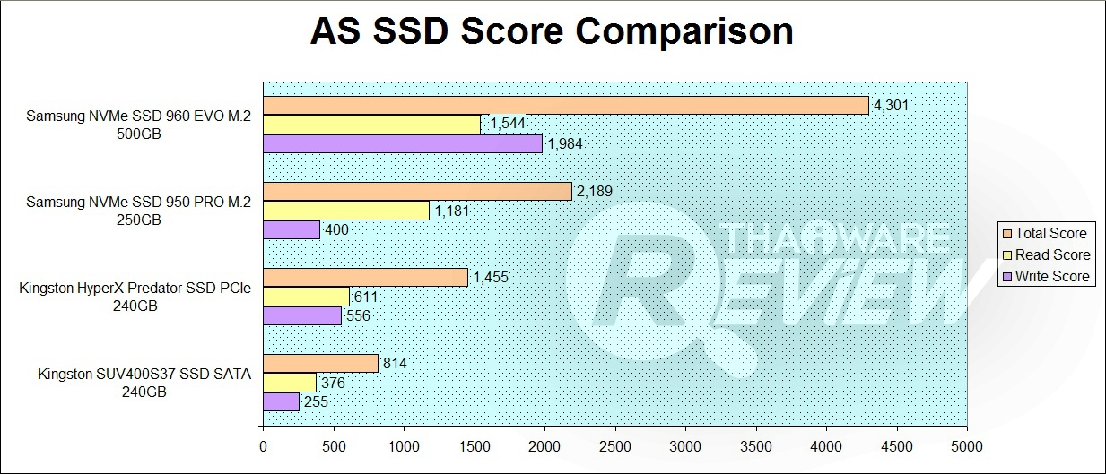 ดูจากผลคะแนนการทดสอบด้วยโปรแกรม AS SSD พบว่า SAMSUNG NVMe SSD 960 EVO ทำคะแนนนำ SSD อีก 3 ตัวอย่างชัดเจน โดยฮาร์ดดิสก์ SSD M.2 ในเจนเนอเรชั่นก่อนหน้า อย่างรุ่น SAMSUNG NVMe SSD 950 PRO ทำคะแนนตามมาเป็นอันดับ 2 ส่วนอันดับที่ 3 เป็นของ Kingston HyperX Predator SSD ซึ่งใช้อินเทอร์เฟสแบบ PCIe และอันดับที่ 4 เป็นของ Kingston SUV400S37 SSD ที่ใช้อินเทอร์เฟสแบบ SATA