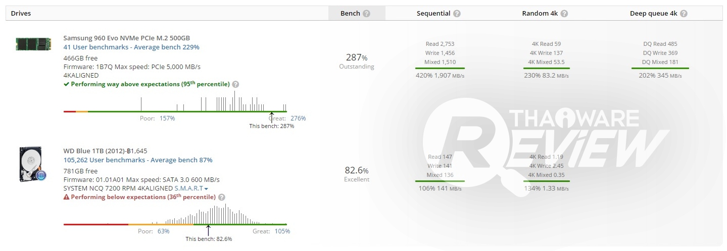 UserBenchmark เป็นอีกหนึ่งโปรแกรมที่นิยมใช้ในการทดสอบประสิทธิภาพฮาร์ดดิสก์ และ SSD เราทดสอบเทียบผลคะแนนกันระหว่าง SAMSUNG NVMe SSD 960 EVO 500GB ที่ใช้อินเทอร์เฟส M.2 เทียบกับฮาร์ดดิสก์แบบแผ่นจานแม่เหล็กที่เชื่อมต่อผ่านสล็อต SATA Express โดยเป็นฮาร์ดดิสก์รุ่น Western Digital Blue ขนาดความจุ 1TB
