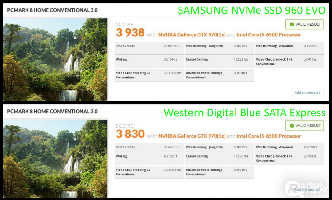 ลำดับต่อมา เราทำการเปรียบเทียบประสิทธิภาพระหว่าง SAMSUNG NVMe SSD 960 EVO M.2 กับ Western Digital Blue ที่ใช้อินเทอร์เฟส SATA Express ด้วยโปรแกรม PCMARK 8 ในหัวข้อการทดสอบ Home ซึ่งเป็นการทดสอบประสิทธิภาพโดยจำลองรูปแบบการใช้งานคอมพิวเตอร์ทั่วๆ ไปในชีวิตประจำวัน อาทิ การท่องเว็บ, การเขียนข้อความเอกสาร, การทำวิดีโอคอล รวมถึงการตกแต่งภาพ และการเล่นเกมส์เบาๆ โดย SAMSUNG ทำคะแนนในหัวข้อการทดสอบนี้ได้สูงกว่าที่ 3,938 คะแนน ส่วนฮาร์ดดิสก์ WD Blue ทำได้ 3,830 คะแนนครับ