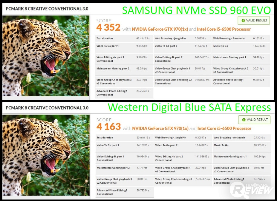 ต่อมาเป็นการทดสอบประสิทธิภาพด้วยโปรแกรม PCMARK 8 ในหัวข้อการทดสอบ Creative ซึ่งเป็นการทดสอบประสิทธิภาพโดยจำลองรูปแบบการใช้งานคอมพิวเตอร์ ทางด้านงานมัลติมีเดีย อาทิ การท่องเว็บ, ตกแต่งภาพ, ตัดต่อวิดีโอ, การทำวิดีโอคอล, การเข้ารหัสไฟล์วิดีโอ และการเล่นเกมส์ ผลปรากฏว่า SAMSUNG NVMe SSD 960 EVO M.2 ทำคะแนนนำไปได้ถึง 4,352 คะแนน โดยฮาร์ดดิสก์แผ่นจานแม่เหล็ก WD Blue ทำได้ 4,163 คะแนนครับ