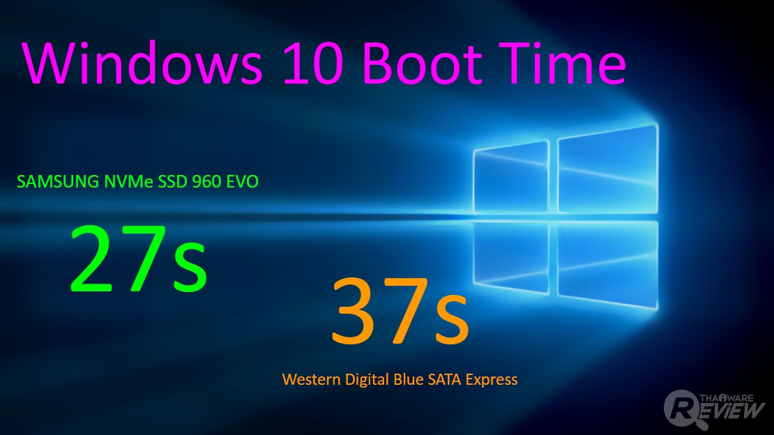 โดยเมื่อลองใช้ฮาร์ดดิสก์แผ่นจานแม่เหล็ก Western Digital Blue ที่เชื่อมต่อผ่านอินเทอร์เฟส SATA Express ใช้เวลาในการบูทระบบ 37 วินาที แต่พอเปลี่ยนมาใช้ Samsung NVMe SSD 960 EVO ก็ใช้เวลาในการบูทเพียง 27 วินาที คือบูทระบบเร็วกว่ากันประมาณ 10 วินาทีครับ น่าจะตอบโจทย์คนชอบความเร็วได้ดี