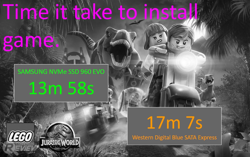 เราทดสอบโดยการติดตั้งเกมส์ Lego Jurassic World ซึ่งในขั้นตอนการติดตั้ง ต้องมีการคลายการบีบอัดไฟล์ขนาดใหญ่ลงในฮาร์ดดิสก์ โดยการติดตั้งเกมส์ลงในฮาร์ดดิสก์ Western Digital Blue ใช้เวลาในการติดตั้ง 17 นาที กับอีก 7 วินาที ส่วน SSD M.2 ของ SAMSUNG นั้นใช้เวลาเพียง 13 นาที 58 วินาที เท่านั้น คือติดตั้งเกมส์เร็วกว่าประมาณ 3 นาทีเลยครับ