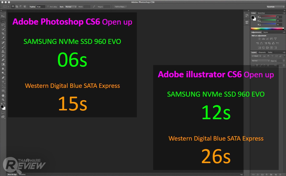 มาดูตัวอย่างการทดสอบ จับเวลาที่ใช้ในการเปิดโปรแกรมขนาดใหญ่อย่าง Adobe Photoshop CS6 และ Adobe illustrator CS6 กันครับ เป็นรายการทดสอบที่ชี้ให้เห็นความแตกต่างในเรื่องของประสิทธิภาพระหว่าง Samsung NVMe SSD 960 EVO กับ Western Digital Blue ได้เป็นอย่างดีเลย