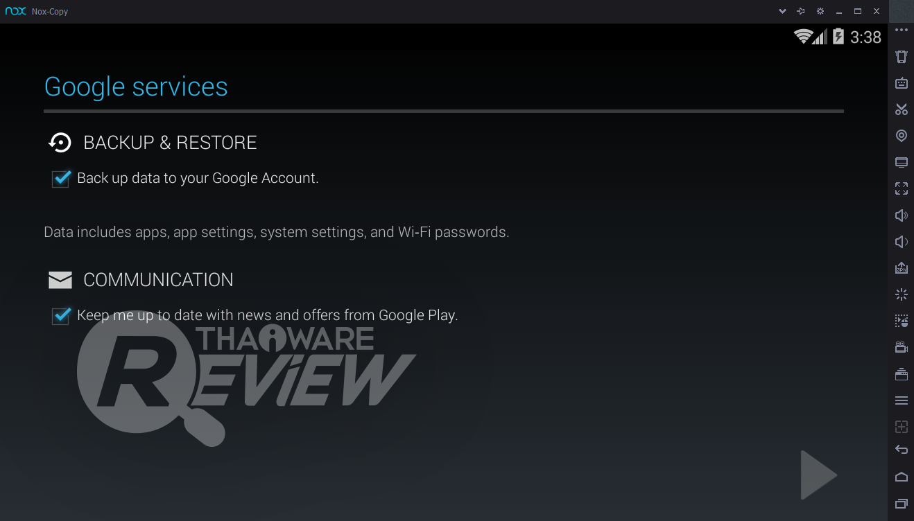 ในส่วนนี้ถ้าคุณต้องการให้ Google สำรองข้อมูลการตั้งค่าและข้อมูลของแต่ละแอปฯ ภายในเครื่อง การตั้งค่าระบบ หรือรหัส Wi-Fi ให้ติ๊กเครื่องหมายถูกข้างหน้าหัวข้อ "Back up data to your Google Account" และถ้าคุณต้องการให้ Google ส่งอีเมลแจ้งข่าวสารและข้อเสนอพิเศษจาก Google Play มาให้คุณ ให้ติ๊กถูกข้างหน้าหัวข้อ " Keep me up to date with news and offers from Google Play" ถ้าไม่ต้องการให้ติ๊กเพื่อนำเครื่องหมายถูกหน้าหัวข้อออก จากนั้นคลิกปุ่ม หัวลูกศร >