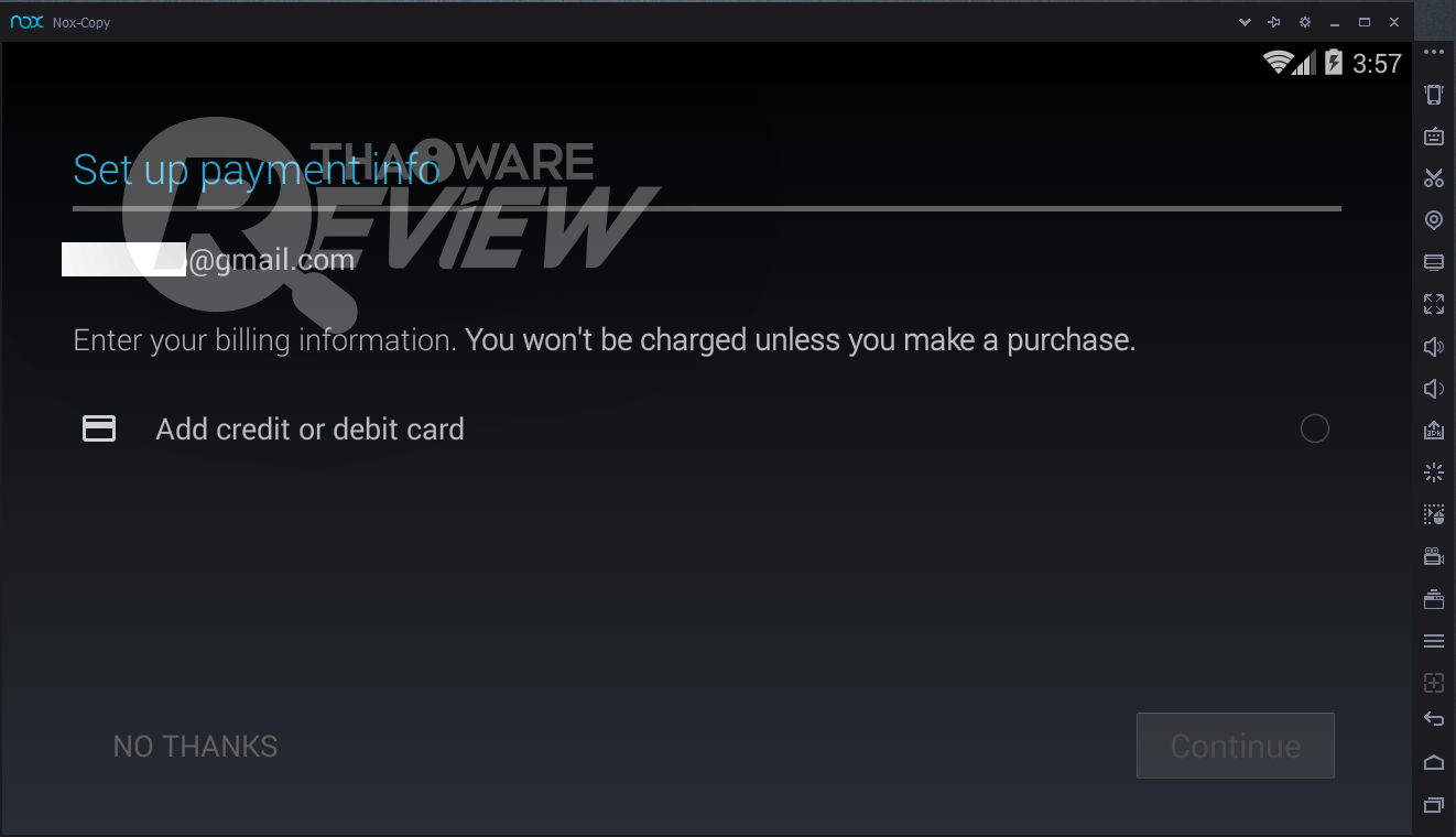 ในส่วนนี้จะแสดงการตั้งค่าข้อมูลการชำระเงินของคุณที่จะใช้ในการซื้อแอปฯ หรือซื้อของภายในแอปฯ ซึ่งคุณสามารถเพิ่มข้อมูลส่วนนี้ได้ในภายหลัง ที่หน้าการตั้งค่าวิธีการชำระเงินบัญชี (Payment methods) ในแอป Play Store คลิก ไม่เป็นไร (NO THANKS) เพื่อข้ามการใส่ข้อมูลในส่วนนี้ แค่นี้ก็สามารถใช้งาน Play Store เพื่อโหลดแอปฯ ฟรี ได้แล้วครับ