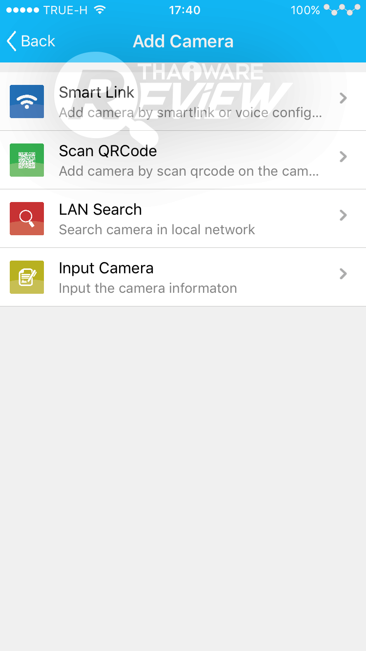 เปิดแอปฯ ขึ้นมา แล้วเพิ่มกล้องเข้าไปในแอปฯ เลือกได้ 4 วิธี ซึ่งผมว่าวิธีที่ง่ายและสะดวกที่สุด คือ สแกน QRCode ครับ โดยใต้ตัวกล้องจะมี QRCode อยู่