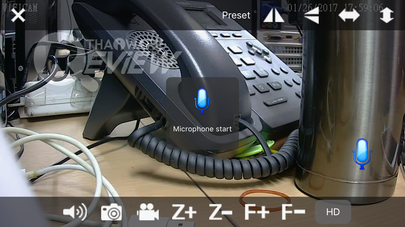 ปุ่มที่ใช้งานได้ คือ ไมค์ ที่ใช้สำหรับพูดโต้ตอบผ่านกล้อง, ถ่ายภาพนิ่ง และบันทึกวิดีโอ ส่วนปุ่มในแถบเมนูด้านบนที่ใช้สั่งหมุนกล้องอัตโนมัติตามทิศทางที่เลือก สามารถใช้งานได้ไม่มีปัญหาครับ
