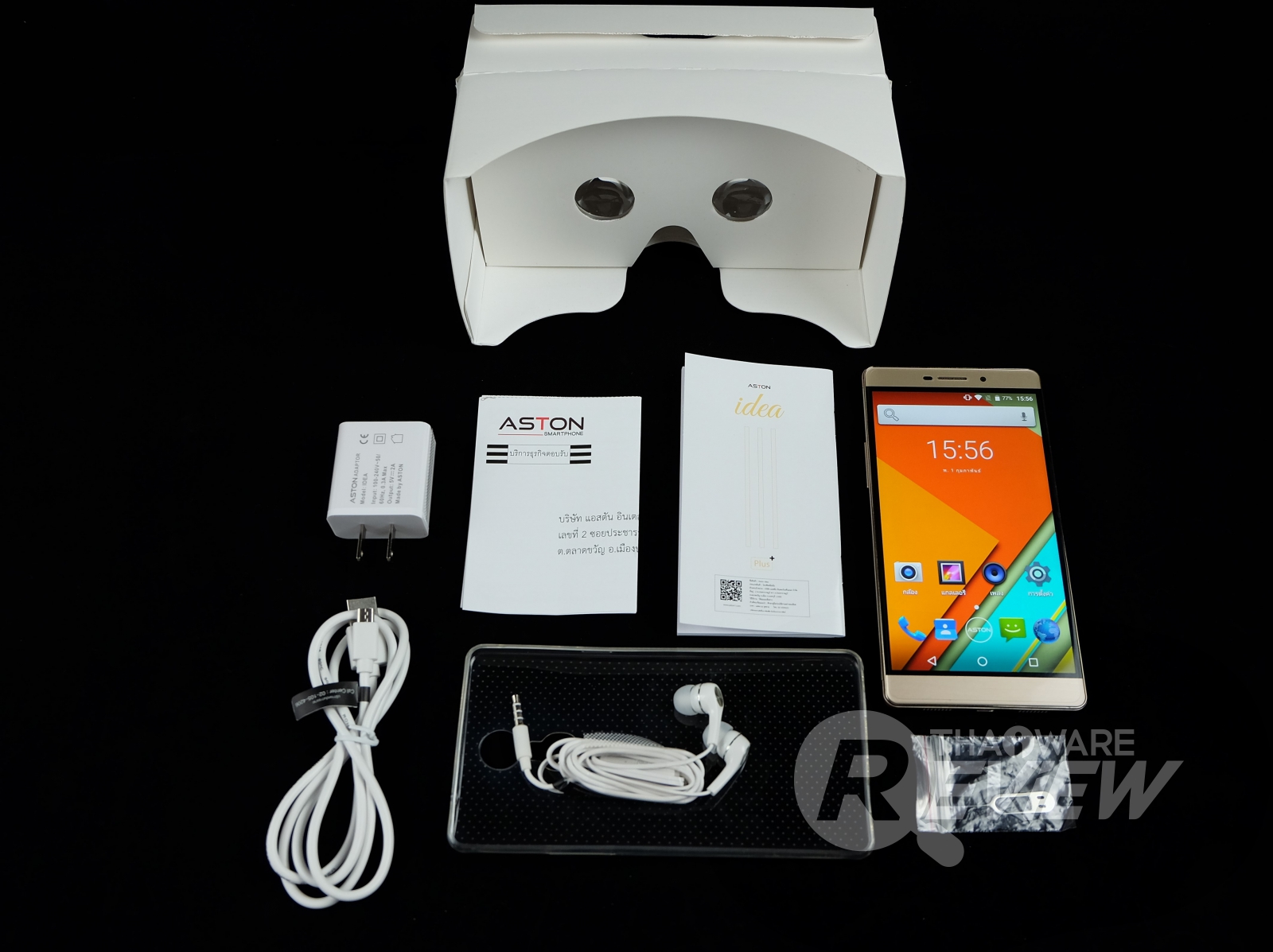 มองจากภายนอก กล่องของสมาร์ทโฟน ASTON Idea 3 Plus ดูเป็นกล่องที่แสนธรรมดา ไม่มีความพิเศษแม้แต่น้อย แต่เมื่อคุณเริ่มที่จะแกะกล่องทีละน้อย คุณจะพบว่าแท้จริงนั้น กล่องของ ASTON Idea 3 Plus สามารถประกอบเป็น VR Cardboard ได้ด้วย ซึ่งภายในกล่องบรรจุอุปกรณ์ไว้ ดังนี้