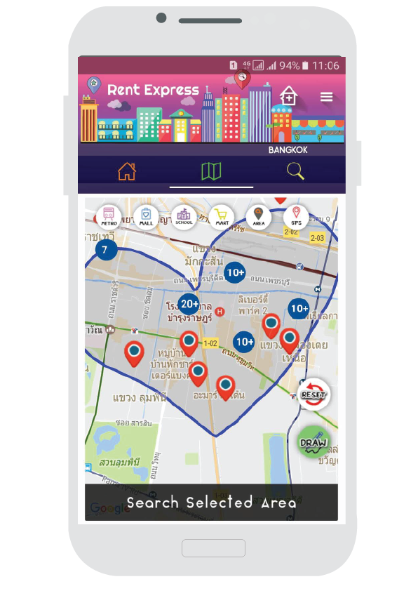 นอกจากนี้ยังสามารถ วาดขอบเขตการค้นหาบนแผนที่ได้อีกด้วย แค่กด Draw จากนั้นก็วาดได้เลย ถ้าจะวาดใหม่ก็แค่กด Reset
