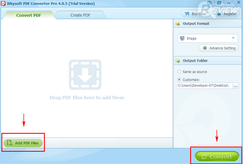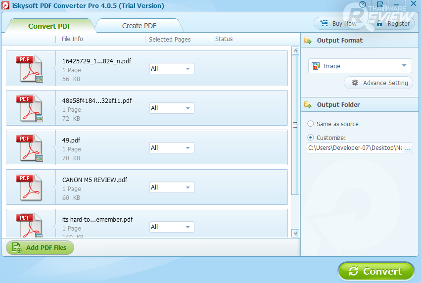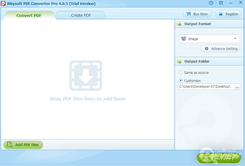 ทางด้านซ้ายล่างของโปรแกรมจะเป็นเมนู Add PDF Files ให้คุณเลือกไฟล์ PDF มาแปลง (คุณสามารถลากมาวางได้เลย) และมุมขวาล่างเป็นเมนู Convert สำหรับกดเพื่อแปลงไฟล์