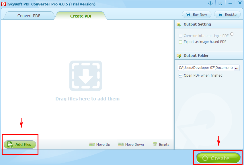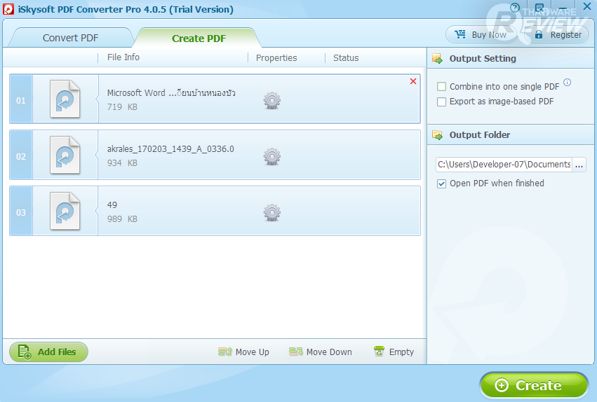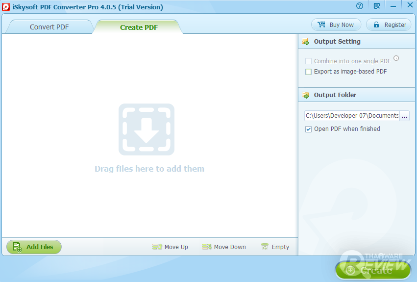 ในส่วนของการ Create PDF เรียกได้ว่าใช้งานง่ายอย่างแท้จริง เนื่องจาก ก่อนจะทำการนำเข้าไฟล์ที่ต้องการแปลงเป็น PDF จะไม่มีเมนูอื่นเลยนอกจาก Combine into one single PDF (รวมไฟล์ทั้งหมดเป็นไฟล์เดียว), Export as image-based PDF (ส่งออก เป็นไฟล์ภาพในรูปแบบไฟล์ PDF), เลือกปลายทาง และ เปิดไฟล์เมื่อแปลงไฟล์เสร็จเท่านั้น