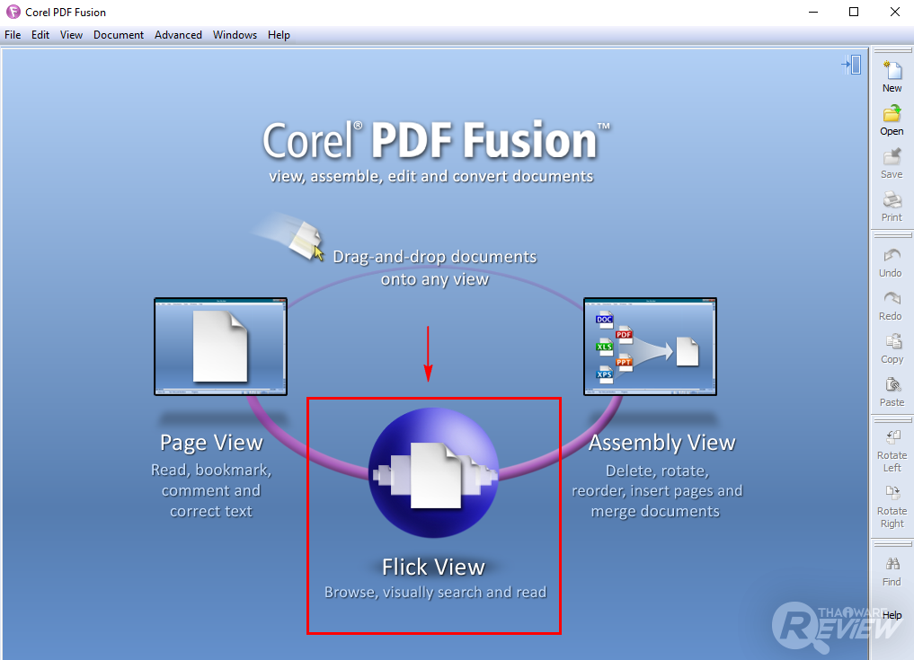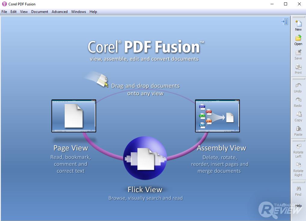 สำหรับใครที่เน้นการใช้งาน ที่ง่ายสะดวกรวดเร็ว และมีฟีเจอร์ครอบคลุมการใช้งาน โปรแกรม Corel PDF Fusion ถือว่าตอบโจทย์คุณแน่นอน เนื่องจากตัวโปรแกรมมี โหมดทั้ง 3 โหมด ที่ให้คุณนำเข้าไฟล์ได้ตามต้องการ ไม่ว่าจะเป็น โหมด Page View ที่ให้คุณสร้าง หรือ แก้ไขเอกสาร, โหมด Flick View ที่ช่วยแสดงไฟล์ในรูปแบบภาพสไลด์ และ โหมด Assembly View ที่จะช่วยรวมไฟล์ ทั้งหมดที่ต้องการไว้ในไฟล์เดียว