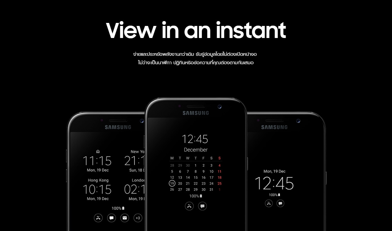Galaxy A ซีรีย์ 2017 มาพร้อมกับอีกหนึ่งฟีเจอร์เจ๋งอย่าง Always on display หน้าจอสามารถแสดงนาฬิกา ปฏิทิน และการแจ้งเตือนข้อความได้ตลอดเวลา โดยไม่มีการปิดหน้าจอ ซึ่งทาง Samsung เคลมมาว่า การเปิดหน้าจอตลอดเวลาแบบ Always on ไม่สิ้นเปลืองพลังงานแบตเตอรี่มากมายแต่อย่างใดครับ