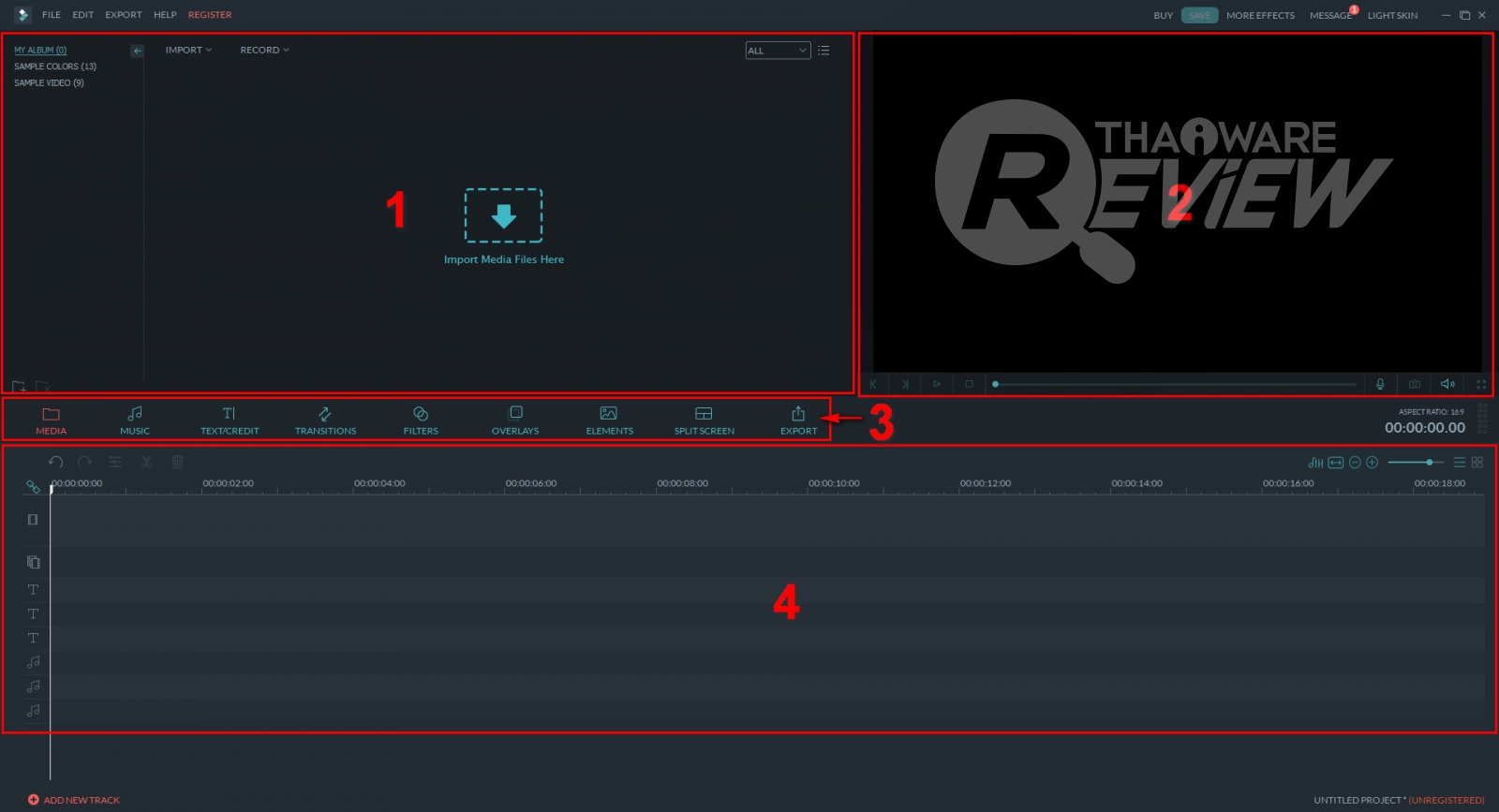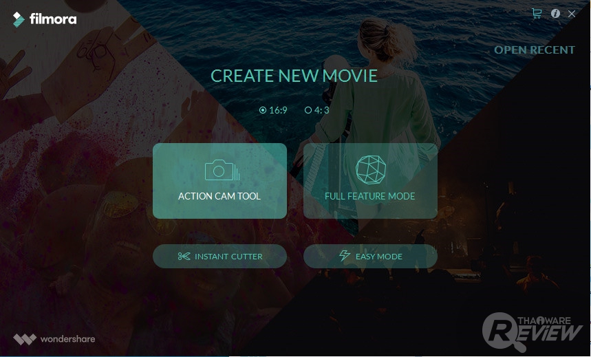 เมื่อเปิดโปรแกรม Filmora ขึ้นมา ตัวโปรแกรมจะมีโหมดต่างๆ ให้เลือกใช้งานตามความเหมาะสมตั้งแต่ Action Cam Tool, Full Feature Mode, Instant Cutter และ Easy Mode รวมทั้งเลือกขนาดของไฟล์วิดีโอได้ ว่าจะเป็นอัตราส่วน 16:9 หรือ 4:3 โดยเรามาดูความสามารถในแต่ละหมวดกันเลยดีกว่า