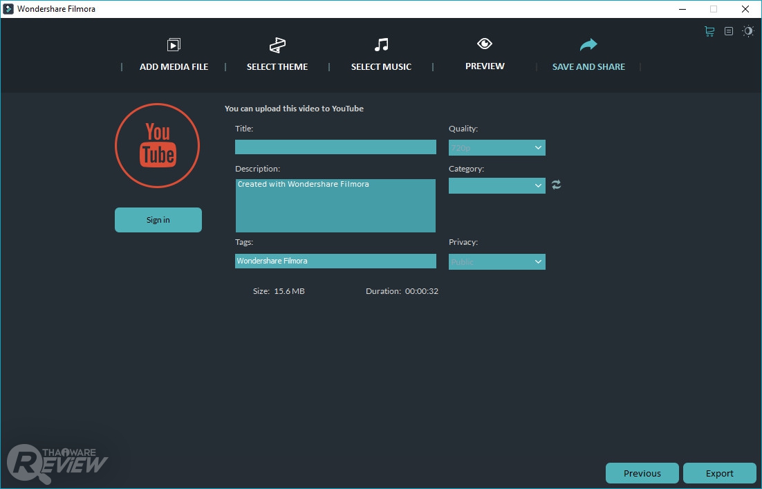 โปรแกรม Filmora มีรูปแบบการ Export ไฟล์ที่ค่อนข้างหลากหลาย ทั้งการเลือกตามชนิดไฟล์, เลือกตามอุปกรณ์ที่ต้องการนำไปแสดงผล, อัพโหลดไปยัง YouTube/Facebook/Video หรือแม้แต่การไรท์ลง DVD ก็สามารถทำได้ภายในตัวโปรแกรมเลย เพิ่มความสะดวกสบายโดยแท้ ลดขั้นตอนการทำงานไปได้เยอะเลย