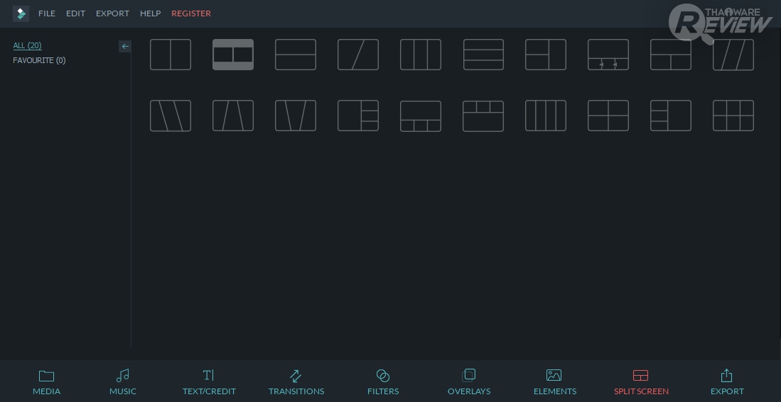 ส่วนนี้จะเป็นที่สำหรับเก็บวัตถุดิบต่างๆ สำหรับใช้งานการตัดต่อ/ตกแต่งวิดีโอ ตั้งแต่ไฟล์ Media (วิดีโอหรือภาพนิ่ง), Music (เพลง), Text/Credit (ข้อความ), Transitions (เอฟเฟคการตัดต่อ), Filters (ย้อมสีวิดีโอ), Overlays (เอฟเฟคตกแต่งวิดีโอ), Elements (ภาพกราฟฟิกตกแต่งวิดีโอ) และ Split Screen (แบ่งหน้าจอ) ซึ่งวิธีการใช้งานแต่ละอย่างนั้น