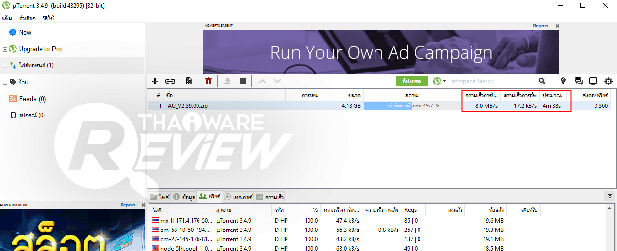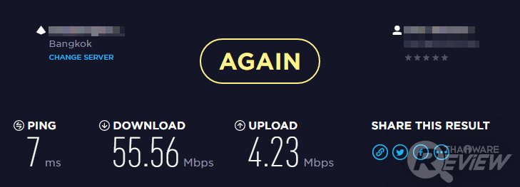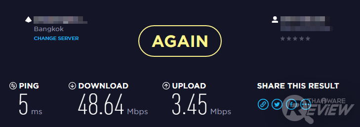 ความเร็วอินเทอร์เน็ต (ปิง / ดาวน์โหลด / อัพโหลด) ที่วัดได้ภายหลังเริ่มต้นโหลดบิตไปแล้ว 1 นาที