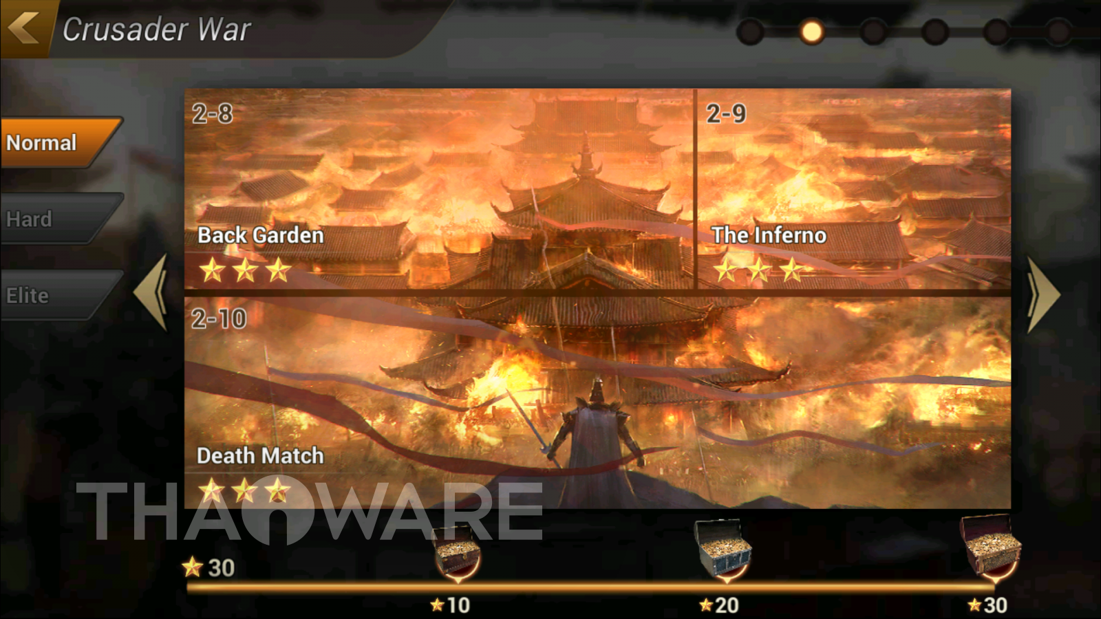 - Conquest โหมดที่เหมาะสำหรับผู้เล่นที่มีขุนพลไว้ใช้งานเยอะในระดับหนึ่ง เพราะในโหมดนี้ผู้เล่นจะต้องส่งขุนพลไปเคลียร์พื้นที่ไปเรื่อยๆ โดยผู้เล่นจะไม่สามารถใช้งานขุนพลที่เคยลงพื้นที่ไปก่อนหน้านี้ซ้ำได้ ต้องรอเวลาให้โหมดรีเซ็ทการลงตัวละครได้เป็นเวลา 1 วันก่อน