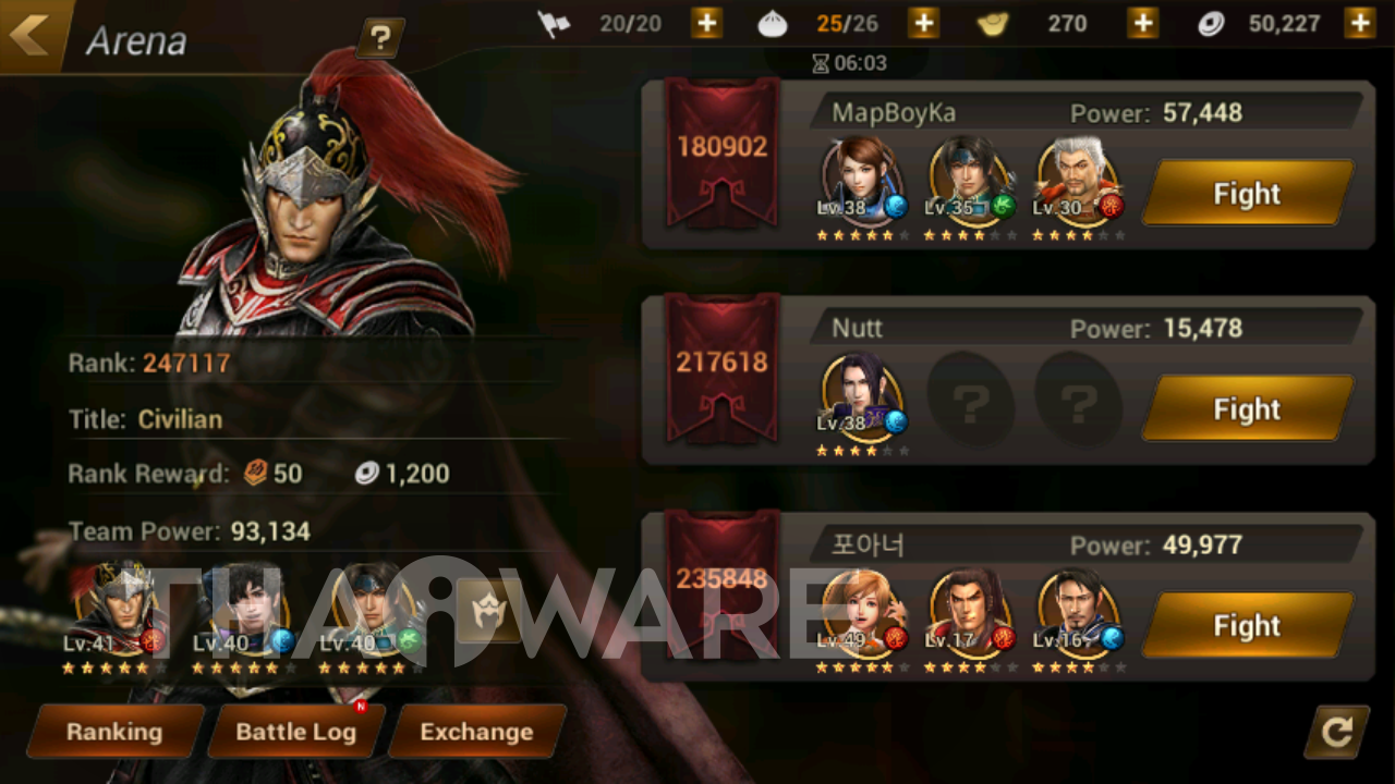 - Battlefield โหมดที่จะเน้นการ PVP หรือปะทะกันของผู้เล่น ซึ่งโหมดนี้เองคือจุดมุ่งหมายสุดท้ายของเกมส์ พร้อมเมื่อไหร่ก็ นำขุนพลของเรามาแสดงฝีมือในโหมดนี้ได้เลย!